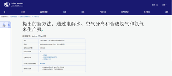 该方法学由印度公司AM Green Ammonia提交,已于2025年5月20日通过初步评估,并于5月23日至6月12日进入公开征求意见阶段。