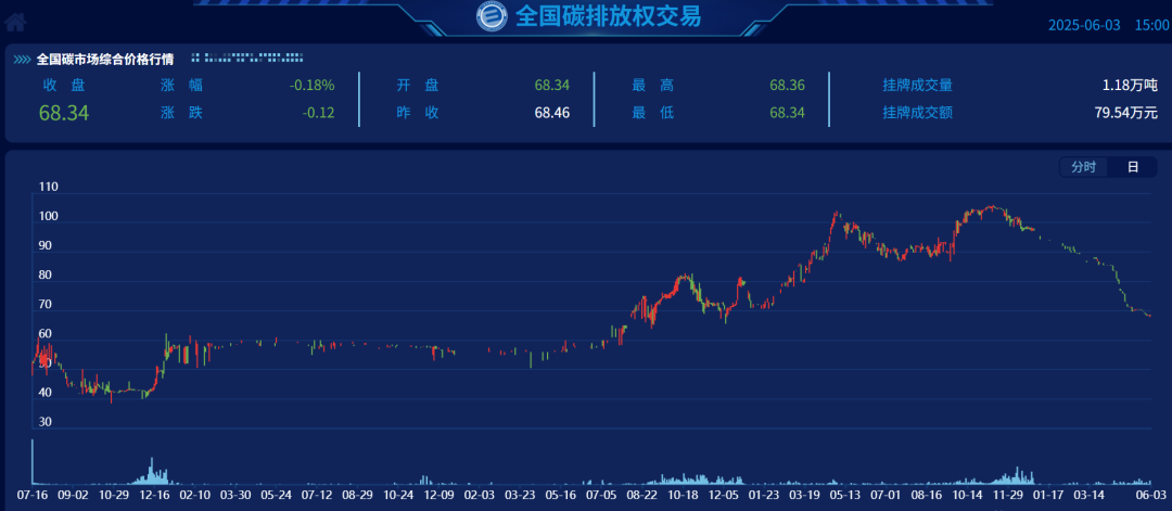 近期,全国碳排放权交易市场(以下简称全国碳市场)CEA(碳配额)价格持续走低,引发市场关注。事实上,今年以来,全国碳市场价格持续走低。5月30日,全国碳市场综合价格行情收盘价为68.46元/吨,较上月最后一个交易日下跌4.20%。复旦大学可持续发展研究中心统计的数据显示,5月全国碳排放配额(CEA)日均收盘价为70.30元/吨,相较于4月的日均收盘价80.87元/吨下跌约13%,同时,5月碳价呈波动下降态势,从月初的71.35元/吨逐步下行至月末盘中的最低价67.91元/吨。