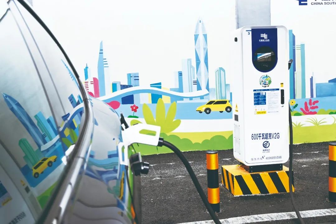 ▲图为位于深圳莲花山超级充电站内的600千瓦V2G超充桩,最快能以“一秒一公里”的速度充放电。
