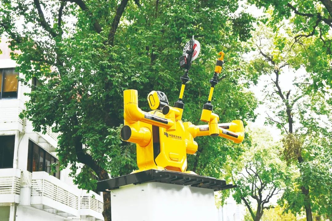 ▲图为南方电网公司自主研发的“悟空”带电作业机器人,可精准完成线路拆接引线、飘挂物清理、设备清洗等带电作业。