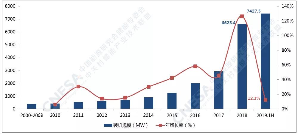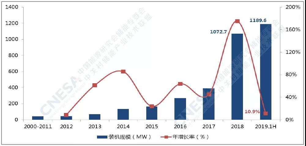 截至2019年6月底,中国已投运电化学储能项目的累计装机规模为1189.6MW,占中国储能市场的3.8%,同比增长142.7%。