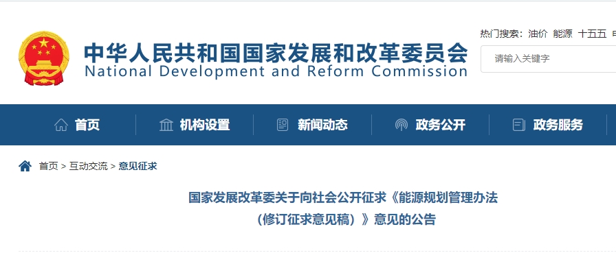 日前,国家发展改革委发布公告,为贯彻落实党的二十届三中全会精神,进一步健全能源规划制度体系,按照《中华人民共和国能源法》有关规定,国家能源局修订形成了《能源规划管理办法(修订征求意见稿)》,现向社会公开征求意见。