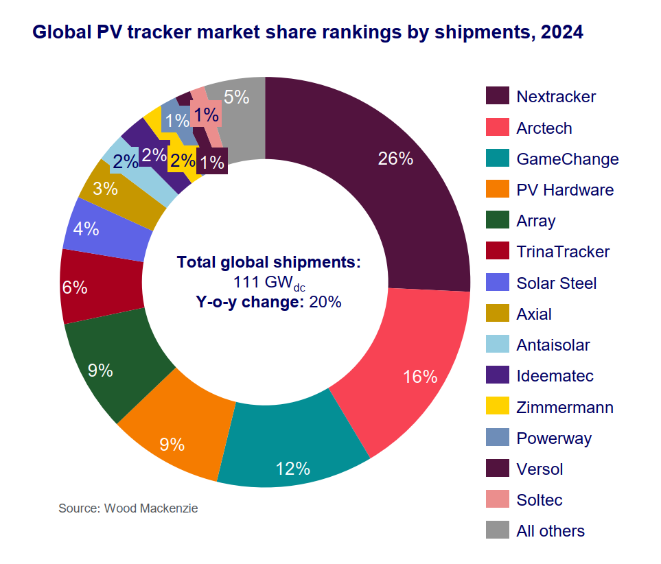 近日,全球知名咨询机构伍德麦肯兹发布《2025年全球跟踪支架市场报告》,报告统计了2024年度全球跟踪支架市场的出货量以及主要跟踪支架企业在各市场的表现及排名。