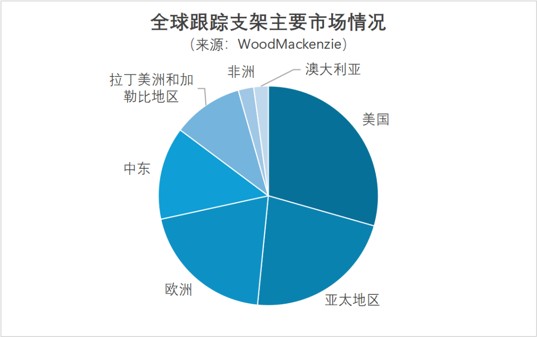 从全球跟踪支架的出货市场可以看到,美国、亚太、欧洲是全球前三大市场,但其中亚太地区大部分的出货集中在印度,中国市场仅有3.6GW左右,仅占全年国内光伏新增装机的不足2%,远低于其他地区。