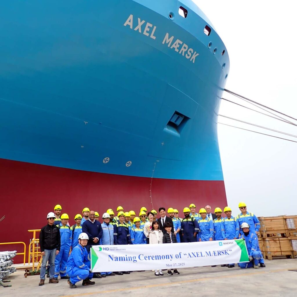 近日,马士基最新一艘16000TEU甲醇双燃料集装箱船“Axel Maersk”号在韩国HD现代重工蔚山船厂正式命名交付,标志着全球首个大型甲醇双燃料集装箱船系列建造项目圆满完成。至此,马士基旗下船队现运营总计13艘甲醇双燃料船,包括1艘2100TEU支线船和12艘16000TEU大型船。
