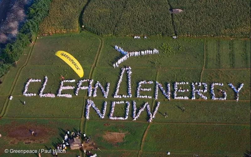 数百人围成的风机和清洁能源图案,呼吁加快使用清洁能源 @Greenpeace /Paul Hilton