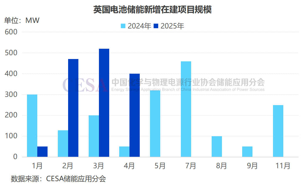 据CESA储能应用分会产业数据库不完全统计,2025年1-4月,英国新增在建电池储能项目1.441GW,较之去年同比增长112.6%。其中,独立储能1.166GW,占比81.96%,规模最大的是科尔本(Coalburn)500MW独立储能电站;新能源配储260MW,占比18.04%,规模最大的是索伊光伏农场和绿色电网公园200MW储能电站。