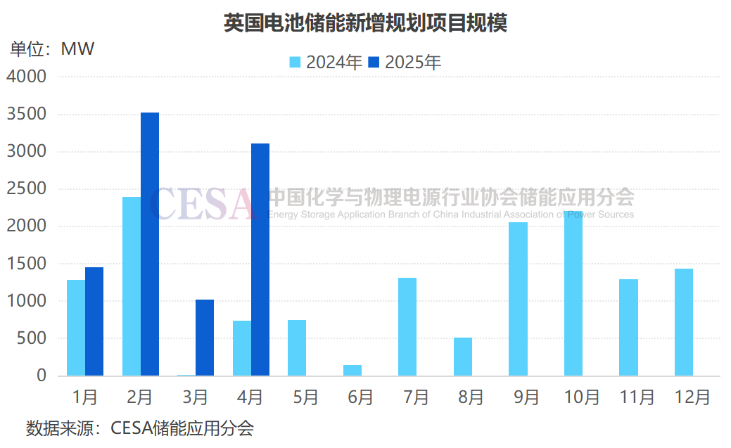 2025年1-4月,英国新增规划许可批准电池储能项目9.11GW,较之去年同比增长105.5%。其中,独立储能高达7.49GW,占比82.26%;新能源配储430MW,占比4.72%;火电配储20MW,占比0.22%;还有部分未披露其电站类型。