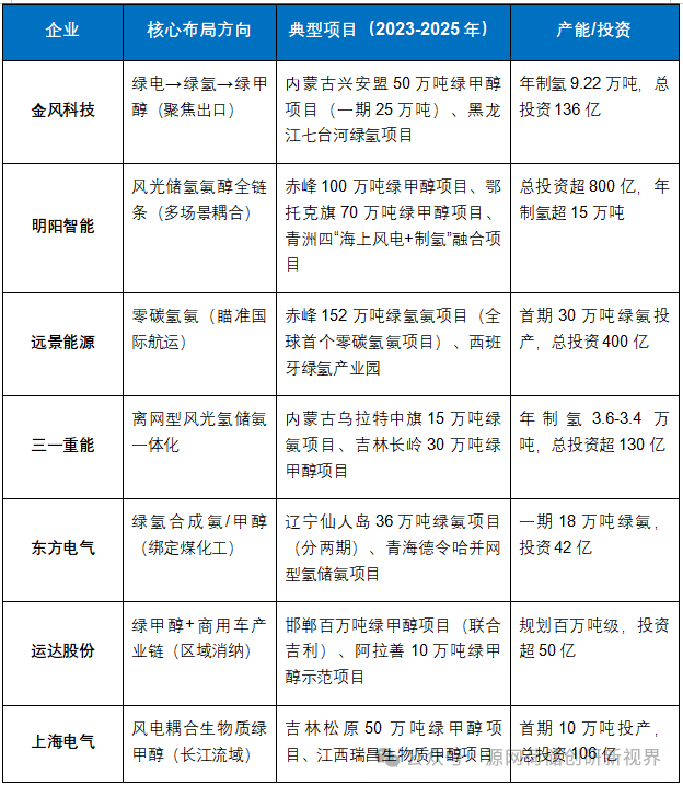 据不完全统计,金风科技、明阳智能、远景能源、三一重能、东方电气、运达股份、上海电气等7家风机巨头已落地或规划24个绿氢醇氨项目,覆盖内蒙古、吉林、新疆、山东、浙江等12省份,形成“北氢南醇”格局: