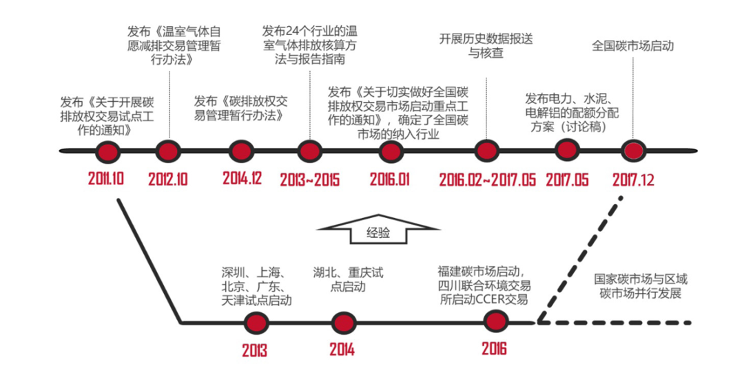 2014年12月,国家发改委发布《碳排放权交易管理暂行办法》(下简称《暂行办法》),为全国碳市场建设提供了法律基 础以及管理框架。此后,党中央、国务院的一系列重大决策中也进一步强调了碳排放权交易机制建设的重要性。2015年4月25日, 中共中央国务院发布《关于加快推进生态文明建设的意见》,明确提出“建立节能量、碳排放权交易制度,深化交易试点,推动 建立全国碳排放权交易市场”。2016年3月,《国民经济和社会发展第十三个五年规划纲要》提出“建立健全碳排放权初始分 配制度,推动建设全国统一的碳排放交易市场,实行重点单位碳排放报告、核查、核证和配额管理制度,健全统计核算、评价考 核和责任追究制度,完善碳排放标准体系”,碳市场建设成为了“十三五”期间落实国家绿色发展理念的具体抓手之一。