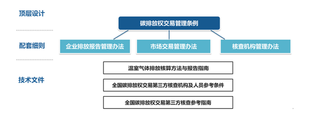 我国碳排放权交易政策体系分为顶层设计、配套细则与技术规范三部分(图3-5)。顶层设计主要解决政府及参与主体权利、 责任和义务方面的法律问题;配套细则主要从各个要素层面解决碳交易相关方的法律问题;技术文件则规定了相关方参与碳交易 的行为标准与规范。