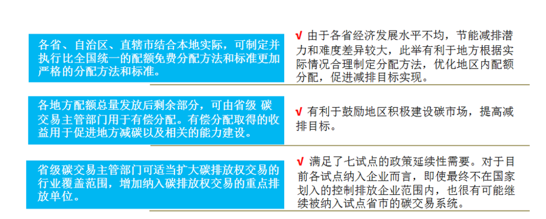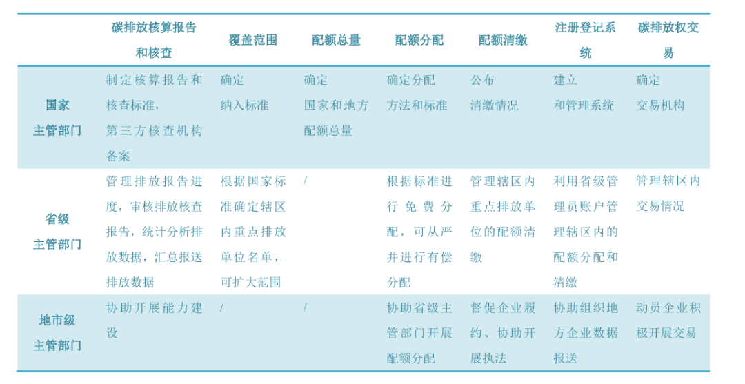 目前我国碳市场的建立和运行遵循的是《碳排放权交易管理暂行办法》。《暂行办法》是第一部国家层面碳市场法规,明确 了国家碳市场建设的制度框架和管理体系,对各主管部门的管理和职能进行了相应的安排。 根据《暂行办法》,全国碳市场将采取两级管理模式,中央政府统筹规划,地方政府协同配合(图4、表1)。在覆盖范围、 配额分配等方面,地方被赋予较大的自主权和灵活度(图5)。