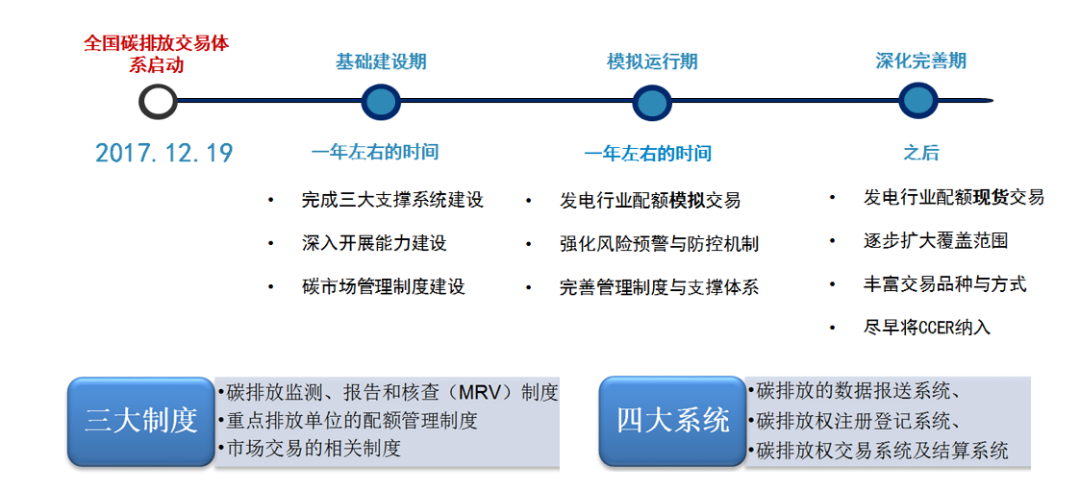 2017年12月,全国碳排放交易体系启动工作电视电话会议召开,《全国碳排放权交易市场建设方案(发电行业)》(下简称《建 设方案》)同步印发,标志着全国碳市场正式启动,《建设方案》以“稳中求进”为原则,提出了全国碳市场建设的“三步走”战略, 在发电行业基础上,未来将进一步考虑其他高耗能、高排放行业,“成熟一个行业,纳入一个行业”,逐步扩大市场覆盖范围。 同时,《建设方案》作为当前和今后一段时期我国碳市场建设的指导性文,明确了全国的碳市场建设的重点任务,即“三大制度” 和“四大系统”建设。需要重点建设的制度包括:MRV制度、配额管理制度、以及市场交易的相关制度。四个支撑系统则包括: 碳排放的数据报送系统、碳排放权注册登记系统、碳排放权交易系统以及结算系统。(图6)
