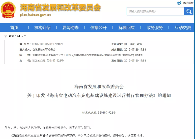 近日,海南省发改委印发《海南省电动汽车充电基础设施建设运营暂行管理办法》,其中明确了充电基础设施的企业准入要求以及补贴政策等,还要求新建居住类建筑需按照配建停车位的100%建设或预留充电条件。