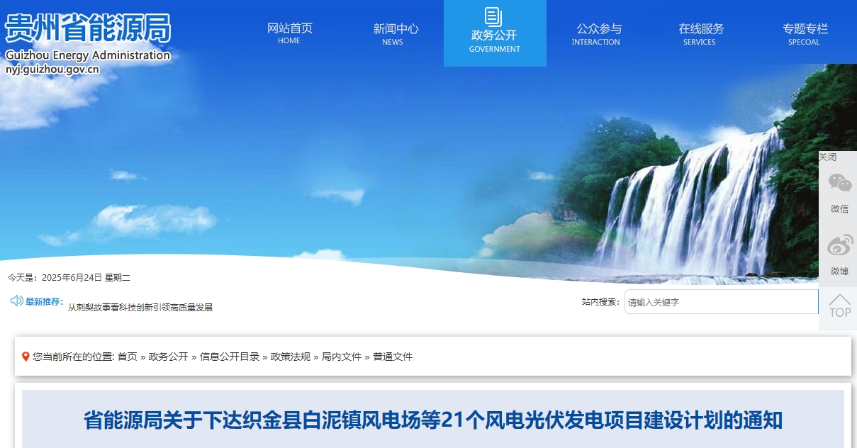 省能源局关于下达织金县白泥镇风电场等21个风电光伏发电项目建设计划的通知