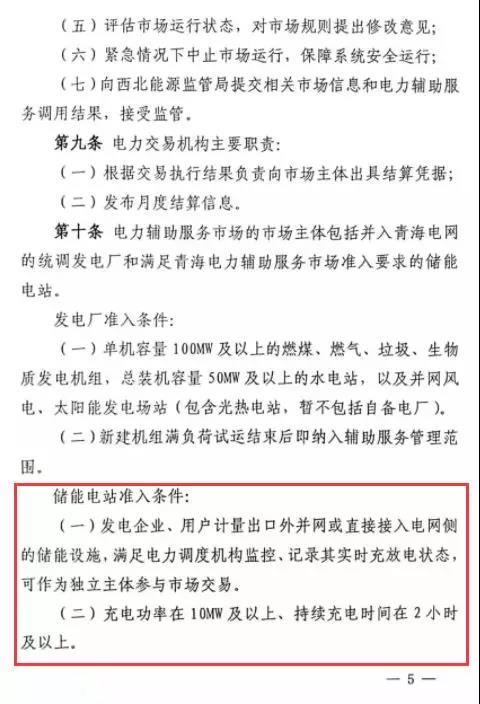 依据《青海电力辅助服务市场运营规则(试行)》,储能电站可作为市场主体参与调峰等辅助服务,电网调用储能设施参与青海电网调峰价格暂定0.7元/千瓦时。准入条件为发电企业、用户侧或电网侧储能设施,充电功率在10MW以上、持续充电时间2小时以上。