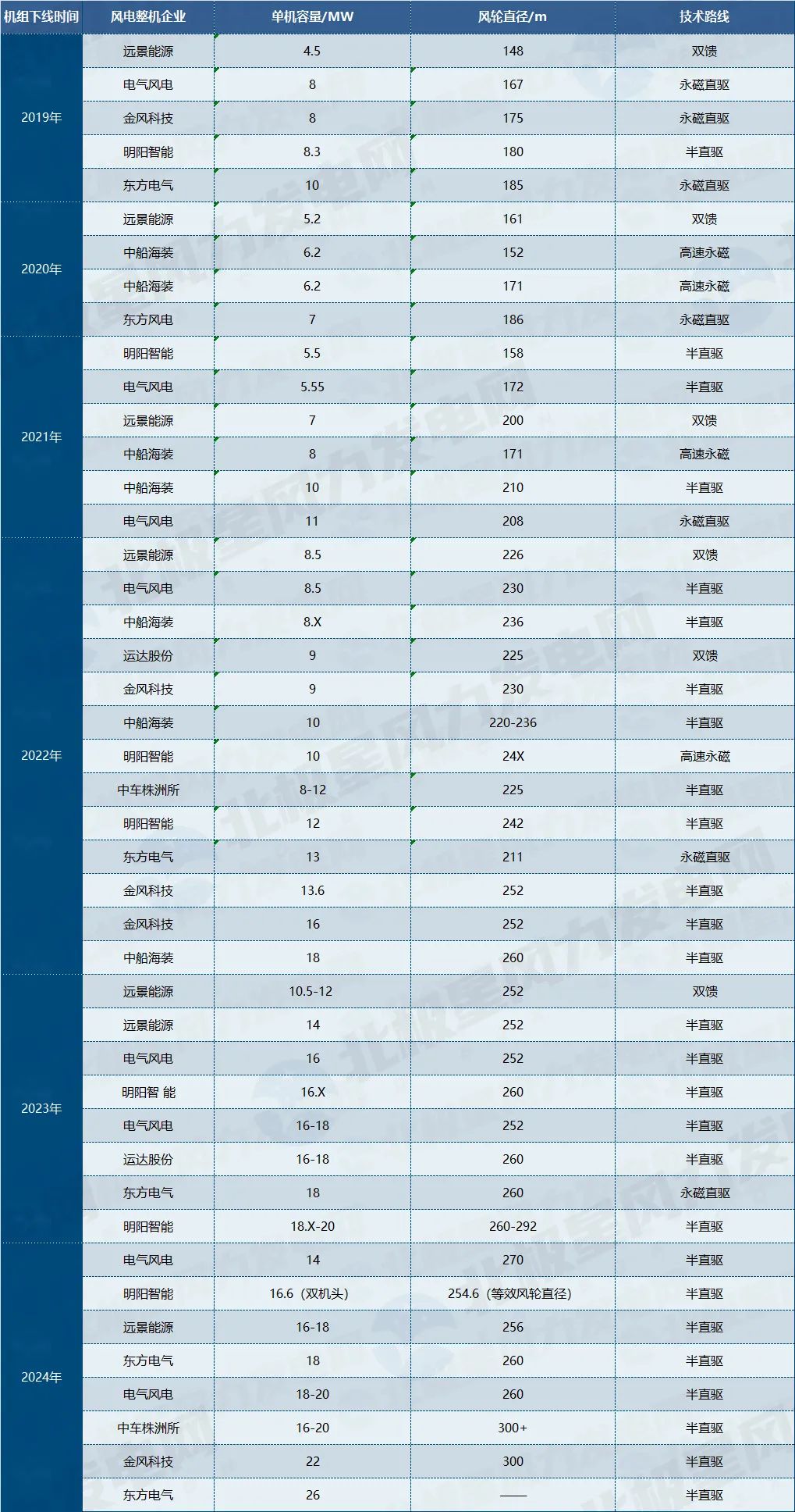 据CWEA统计的2024年中国下线的海上风电机型数据显示,在2024年下线的全部海上风电机型中,技术路线越发单一,全部为半直驱机型。这表明,经过2-3年的市场验证,半直驱技术路线已被绝大多数厂商接受,成为权衡海上风电机组产品低成本、高可靠性与高效率“不可能三角”的最佳选择。