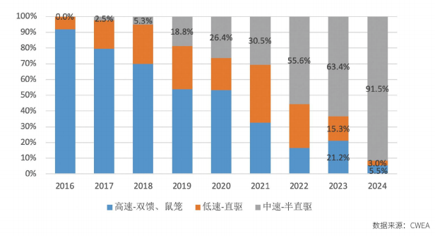 2016-2024年中国海上风电机组不同技术类型新增装机容量占比