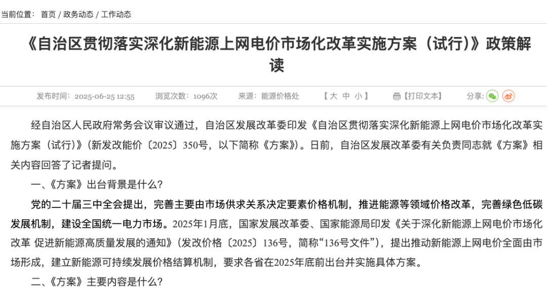 6月25日,新疆发改委官网发布《深化新能源上网电价市场化改革 助力新能源高质量发展》(下称《方案》)和《自治区贯彻落实深化新能源上网电价市场化改革实施方案(试行)》政策解读。
