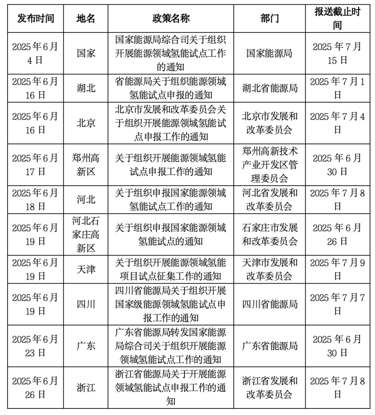 6月26日,浙江省省发展改革委发布《浙江省能源局关于开展能源领域氢能试点申报工作的通知》。申报方向:氢能试点包括项目试点和区域试点,试点方向包括规模化制氢及一体化,先进柔性离网制氢,清洁低碳氢能综合开发,规模化、长距离输送,高密度、多元化储存,炼油及煤制油气绿色替代,氢氨燃料供电供能,氢储能长时长效运行,能源领域综合应用,氢能实证实验平台和氢能低碳转型试点。各地市能源主管部门做好申报组织工作,并对申报材料进行审核。于2025年7月8日前报送省能源局新能源处。