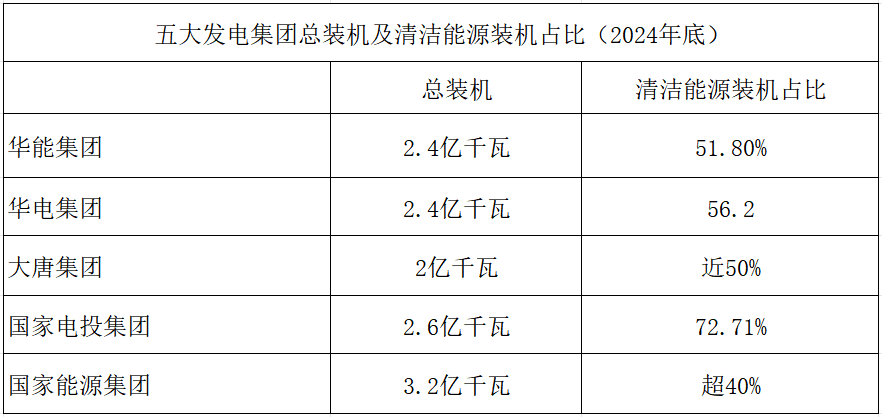此后4年左右时间内,“五大六小”拼尽浑身解数争先恐后上马新能源项目,基本都已提前实现了新能源装机目标。例如,截至2024年底,国家电投集团光伏、风电累计装机规模分别达到6059万千瓦、8414万千瓦,合计占到总装机的55%。
