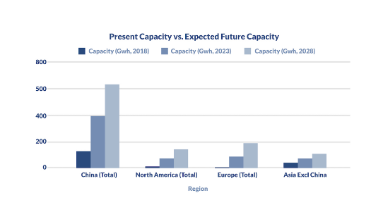 今天,LFP化学在中国市场占主导地位,占电池化学总需求的44%以上。尽管世界其他地区更喜欢NMC化学品,但未来十年中国在该领域的主导地位将增加LFP与NMC相比的优势。中国在磷酸盐等土壤材料方面的大量资源也导致了这种化学物质的偏好。