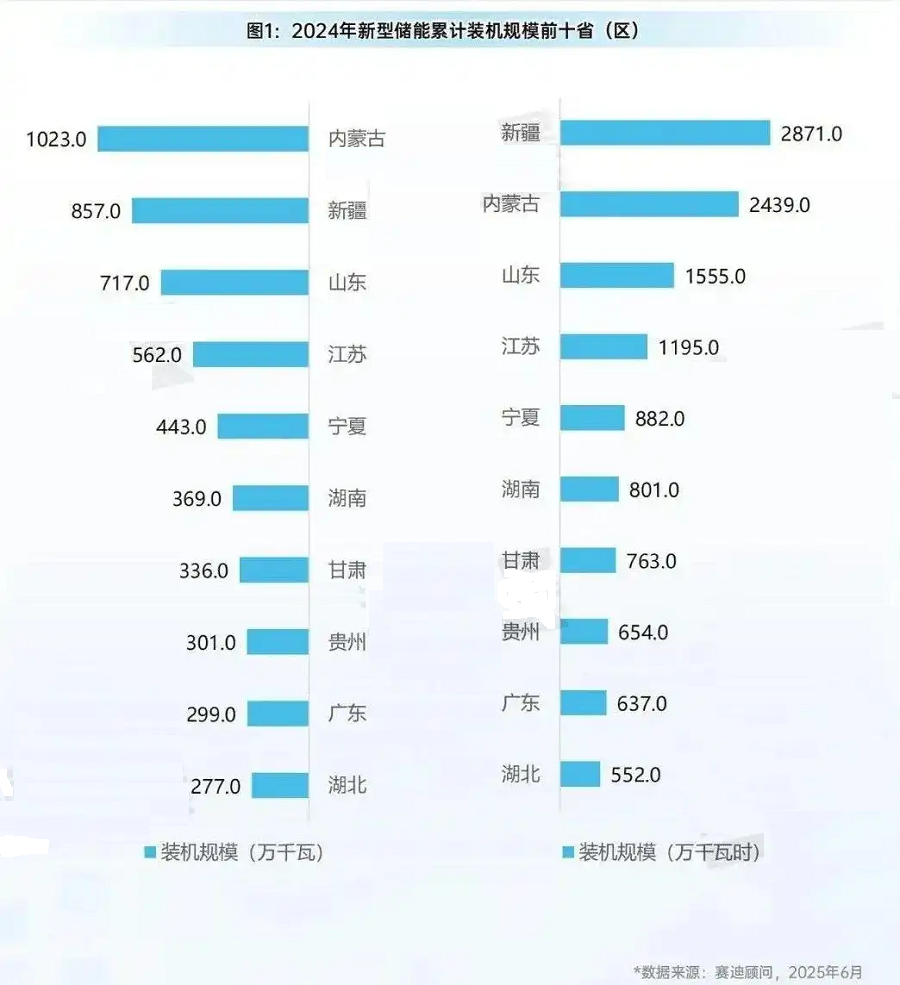 2024年,内蒙古新增新型储能装机708万千瓦,同比增长2.4倍,总装机规模突破1000万千瓦,成为全国首个突破千万千瓦的省份。截至2025年一季度,内蒙古新型储能累计装机达1086万千瓦。