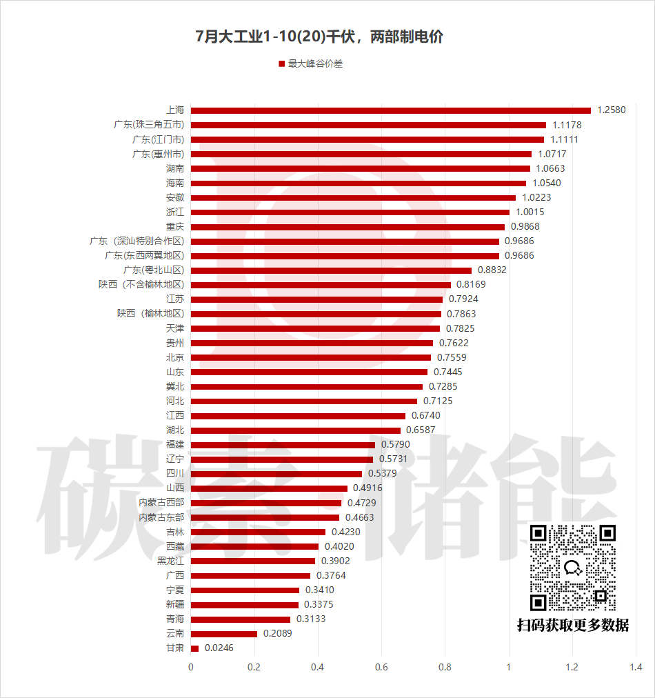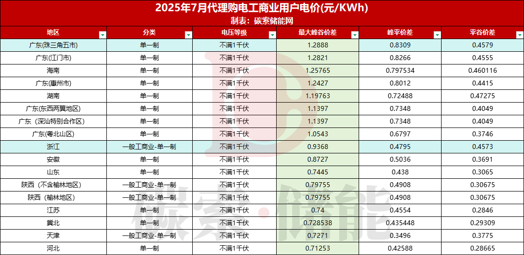 在单一制且电压不满1千伏条件下,广东(珠三角五市)7月最大峰谷价差达1.2888元/KWh,领先全国。和广东(江门市)、海南等17地峰谷价差超0.7元/KWh。