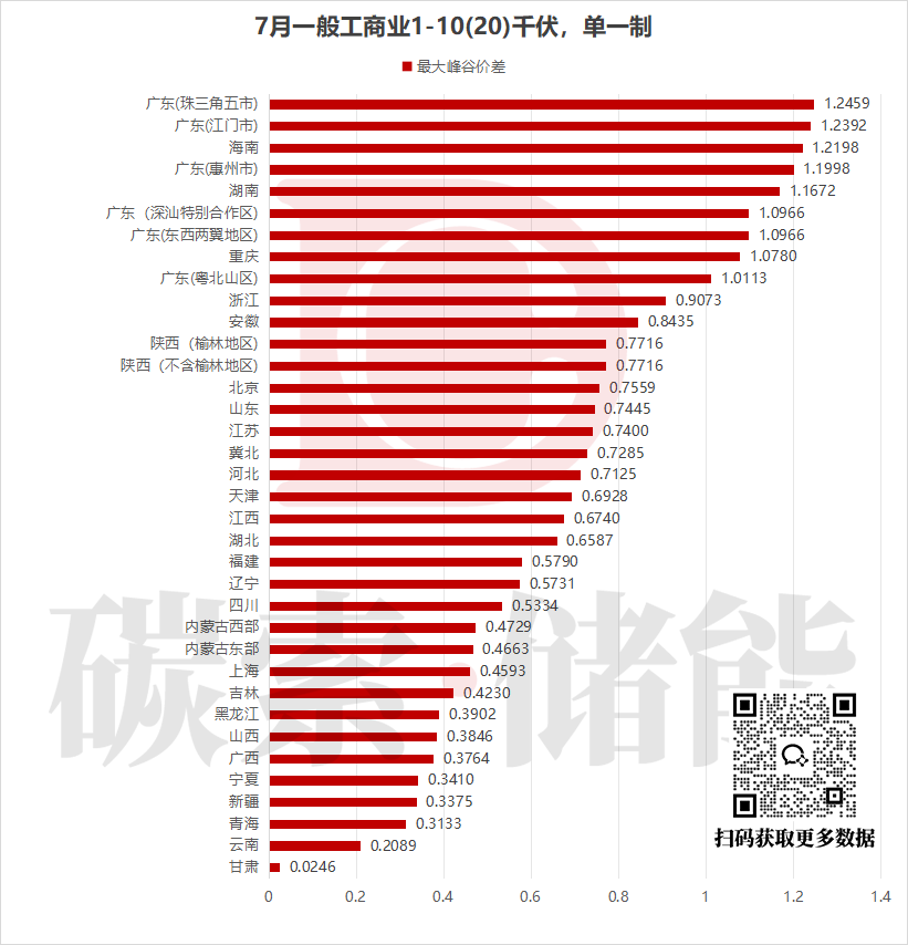 同等条件下,广东各市区、江苏、北京、浙江7月的峰谷价差环比增幅超20%以上。