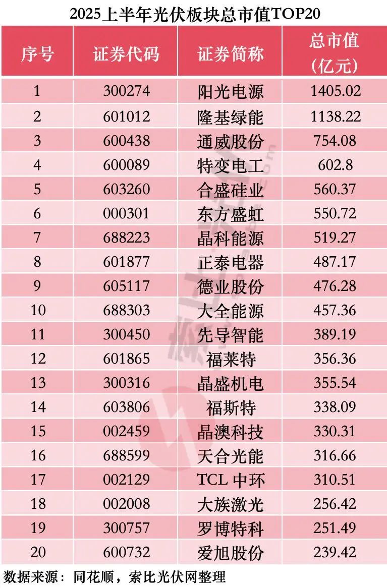 不过,这些表现优异的光伏标的,基本为中小市值个股,龙头企业们依然处于下跌趋势中。截至2025年6月30日收盘,千亿市值的光伏企业仅剩阳光电源和隆基绿能两家,TOP10的“门槛”已经下降至400亿元。受此影响,中证光伏产业指数(CSI:931151)的跌幅达到11.64%。