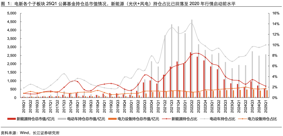 根据长江证券研报,截至2025年第一季度末,光伏板块机构重仓市值占A股总持仓比例仅为1.83%,环比降幅高达0.59pct,处于历史低位。这与2020年双碳目标发布前的水平相当,且已经低于2017年、2019年的部分阶段。