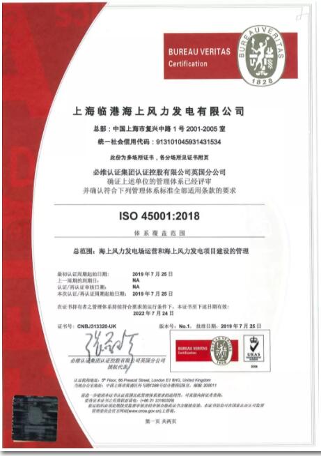 7月25日,临港海上风电正式取得必维认证集团颁发的体系证书,这是必维认证集团在海上风电行业领域发放的首张ISO 45001职业健康安全管理体系证书。