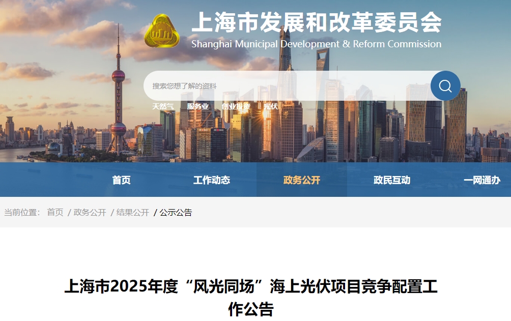 按照《上海市发展和改革委员会关于印发〈上海市可再生能源项目竞争配置管理办法〉的通知》(沪发改规范〔2024〕2号)、《上海市“风光同场”海上光伏开发建设方案》(沪发改能源〔2024〕177号)、《上海市发展改革委关于公布<上海市2025年度“风光同场”海上光伏项目竞争配置工作方案>的通知》(以下简称《工作方案》)要求,现就上海市2025年度上海市“风光同场”海上光伏项目竞争配置工作公告如下: