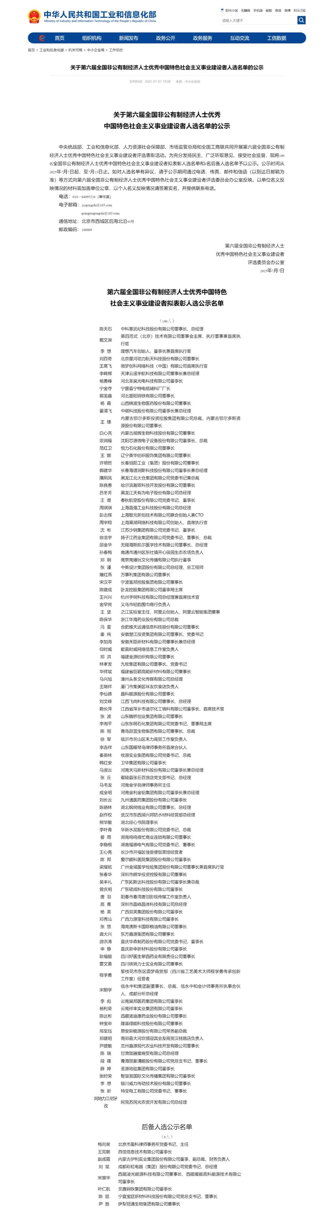 7月7日,工信部发布《关于第六届全国非公有制经济人士优秀中国特色社会主义事业建设者人选名单的公示》,本次名单包括100名全国非公有制经济人士优秀中国特色社会主义事业建设者拟表彰人选名单和8名后备人选名单。