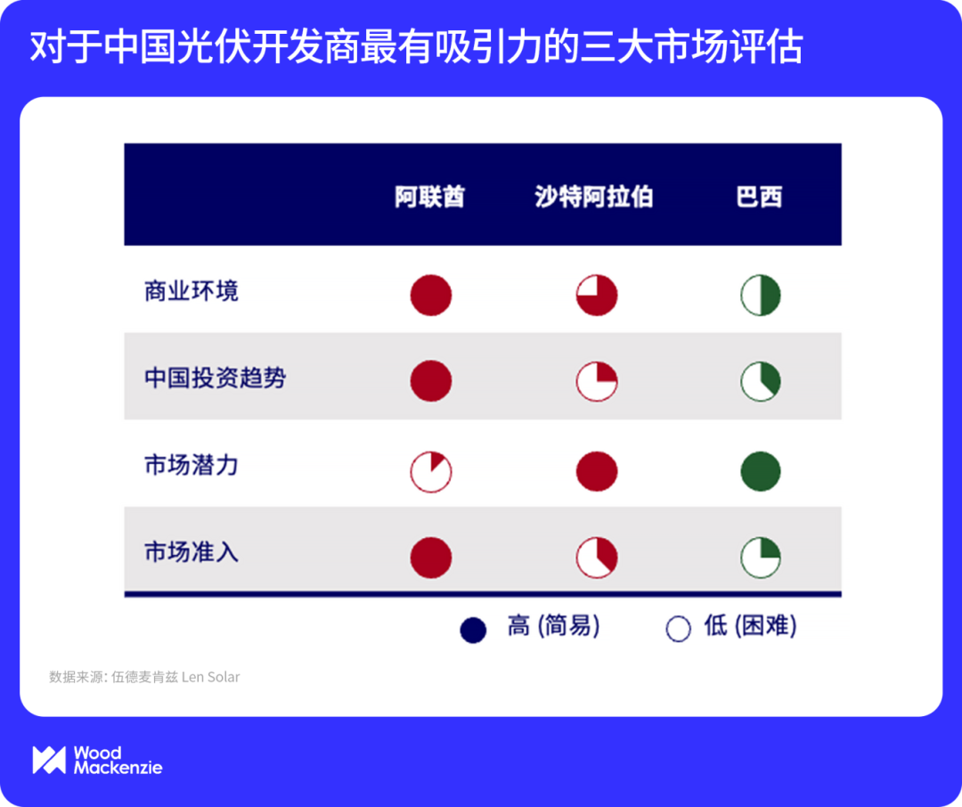 伍德麦肯兹基于商业环境、投资惯性、市场潜力和准入难度进行市场吸引力评估,发现排名前三的阿联酋、沙特、巴西市场具有共同特点:政策协同度较高、电力需求高增长与准入壁垒较低。