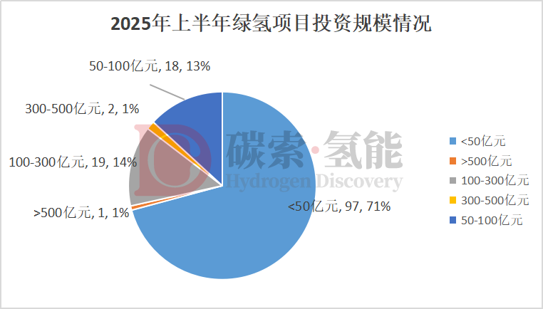 从投资规模来看,上半年有137个绿氢项目公布了项目的投资规模,其中,投资额大于500亿元、300 - 500亿元、100 - 300亿元、50 - 100亿元、小于50亿元项目分别有1个、2个、19个、18个、97个,占比分别为1%、1%、14%、13%、71%。如下图: