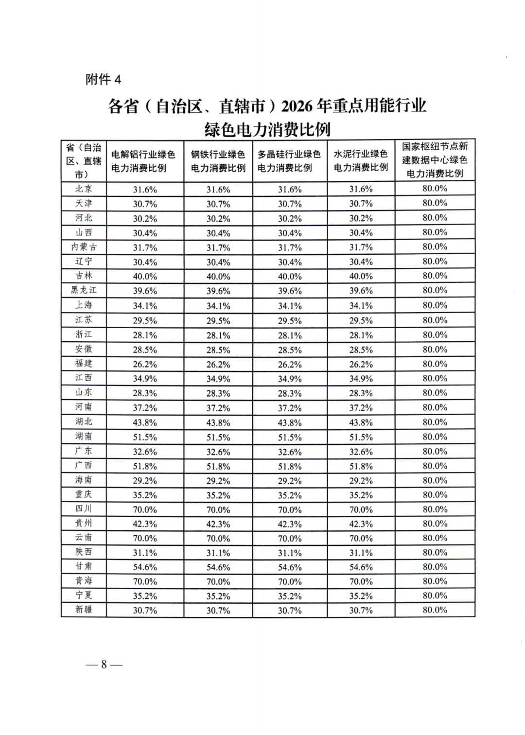 另外,文件指出,各省(自治区、直辖市)可再生能源电力消纳责任权重完成情况核算,以本省级行政区域实际消纳的物理电量为主、以省级绿证账户购买省外的绿证为辅,2025年可再生能源电力消纳责任权重应在当年完成,不再转移至2026年。重点用能行业绿色电力消费比例完成情况核算以绿证为主,2025年各省(自治区、直辖市)对电解铝行业绿色电力消费比例完成情况进行考核,对钢铁、水泥、多晶硅和国家枢纽节点新建数据中心绿色电力消费比例完成情况只监测不考核。