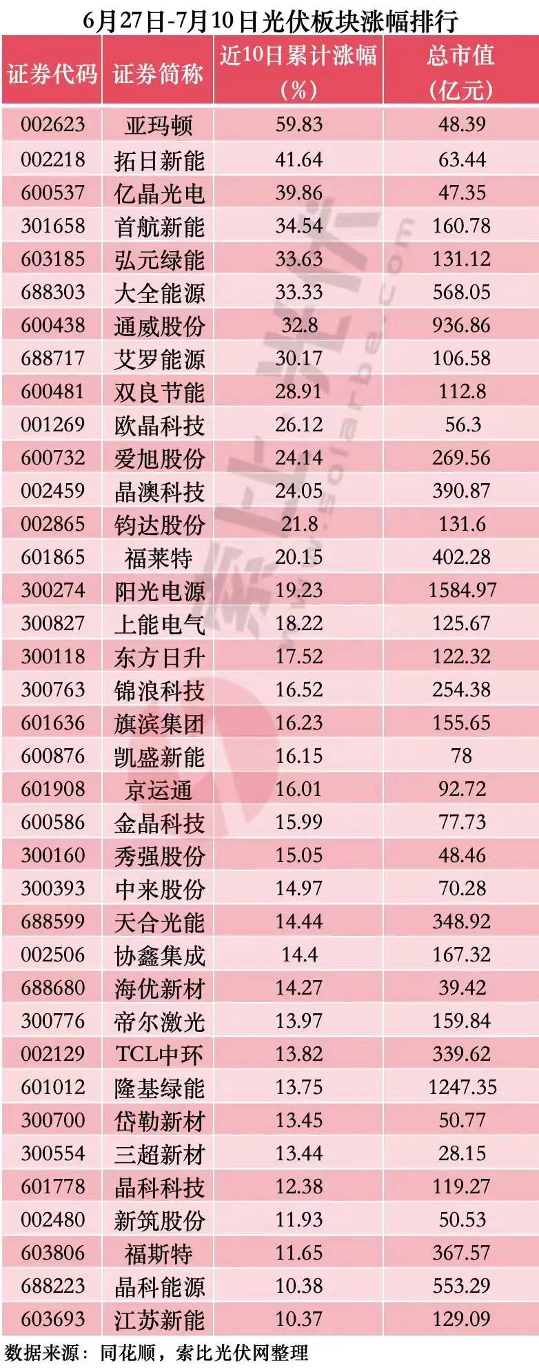 个股方面,更是几乎全线上涨,近10个交易日涨幅超过20%的个股达到15只。其中,亚玛顿涨幅高达59.83%,期间收获了4个涨停板;拓日新能涨幅超过40%;亿晶光电、首航新能、弘元绿能、大全能源、通威股份、艾罗能源涨幅超过30%。