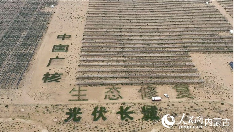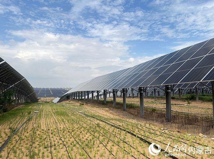 光伏基地通过“板上发电、板下修复、板间种植”的模式,有效的改善了沙漠生态环境。人民网 孟佳澍摄