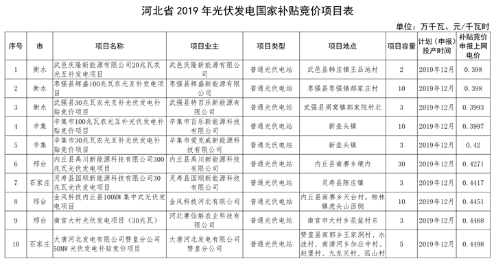 日前,河北省发改委按照国家能源局《关于公布2019年光伏发电项目国家补贴竞价结果的通知》要求,下达河北省2019年光伏发电国家补贴竞价项目计划。
