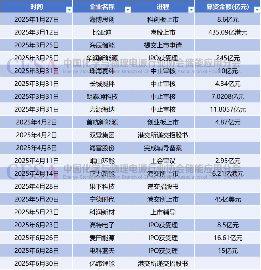 进入二季度后,市场活跃度呈现波浪式回升,4月2日首航新能源创业板上市与双登集团递表形成差异化路径,宁德时代5月20日以45亿美元创下上半年最大融资纪录,其选择港交所二次上市的决策,与比亚迪3月港股募资435亿港元形成战略呼应,显示出行业龙头对国际化资本平台的偏好。值得关注的是,6月下旬麦田能源、电科蓝天等企业密集获IPO受理,似乎预示着三季度将迎来新的上市窗口期。