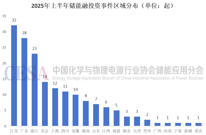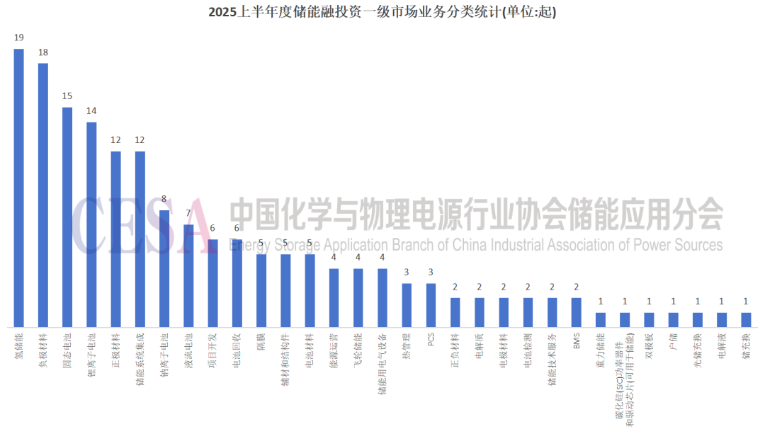 2025年上半年,我国储能领域一级市场投融资活动呈现多元化与技术驱动并行的特征。氢储能以19起融资领跑,凸显其在长时储能和清洁能源转换中的战略地位;负极材料紧随其后18起,反映电池产业链对核心材料性能提升的持续投入。