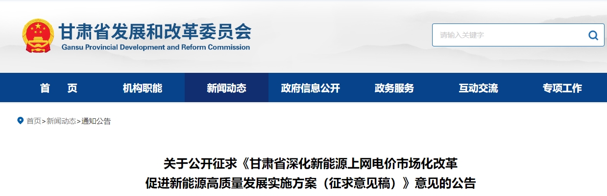 为贯彻落实《国家发展改革委 国家能源局关于深化新能源上网电价市场化改革促进新能源高质量发展的通知》(发改价格〔2025〕136号)要求,结合甘肃实际,省发展改革委牵头起草了《甘肃省深化新能源上网电价市场化改革促进新能源高质量发展实施方案(征求意见稿)》,现面向社会公开征求意见。