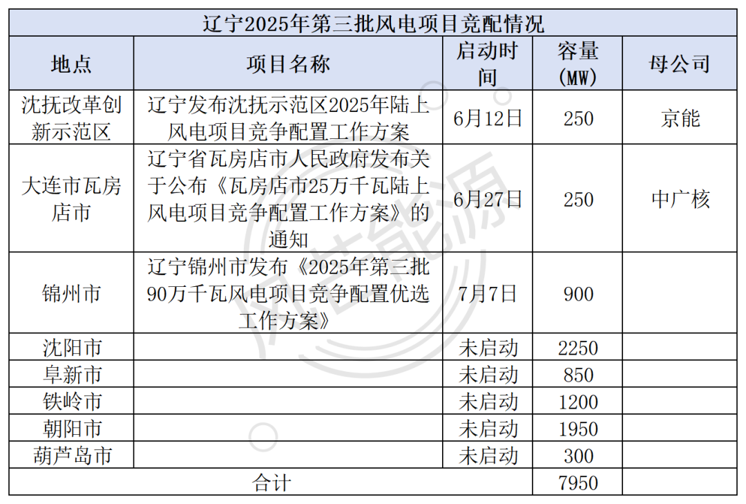 锦州市7月7日启动了2025年第三批90万千瓦风电项目竞配,尚未公布结果。剩余6.55GW均未启动竞配。
