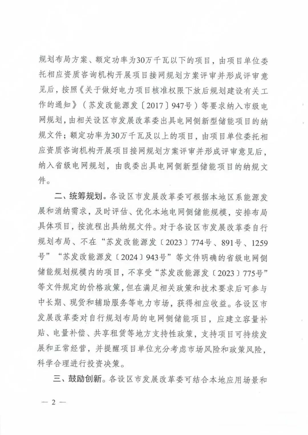 近日,江苏省发展和改革委员会向各设区市发展改革委,国网江苏省电力有限公司印发《关于优化电网侧新型储能项目规划管理工作的通知》。文件第一条即指出:简化流程,请各设区市发展改革委根据本地区电网发展和新能源消纳需求,按照《关于加强各地新型储能项目规划布局的通知》(苏发改能源发〔2023〕891号)等要求,研究编制本地区电网侧新型储能规划布局方案,依规明确项目投资主体,适时滚动优化调整,并抄送我委。