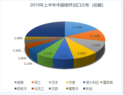 2019年越南光伏市场的崛起之势进一步提速。2019年上半年中国光伏产品(硅片、电池、组件)出口总额106.1亿美元,同比增长31.7%,其中组件出口额大幅增长,组件出口量约36GW,同比增长近一倍。
