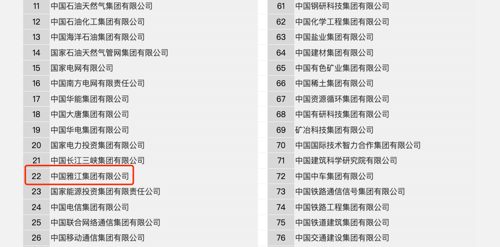根据最新央企名录,中国雅江集团有限公司“序号”为22,位列中国长江三峡集团有限公司和国家能源投资集团有限责任公司之间,成为第99家央企。