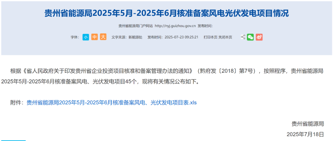 7月23日,贵州省能源局发布《2025年5月-2025年6月核准备案风电光伏发电项目情况》。