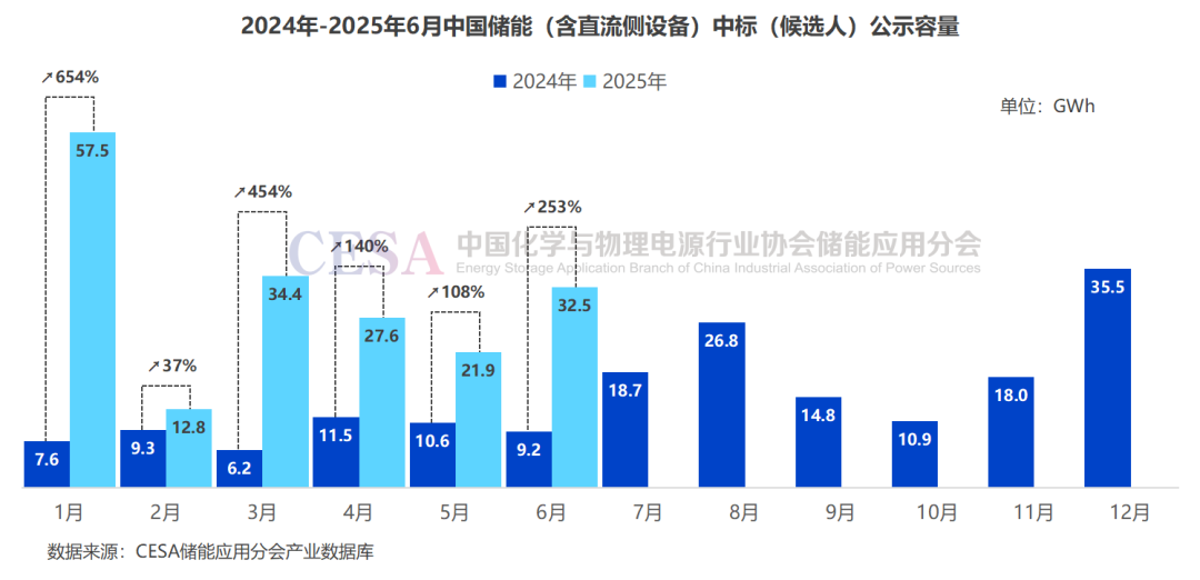 在储能行业,2025年上半年,海外、国内市场需求都在高速攀升,最终引发终端对储能电芯的需求上涨。据CESA储能应用分会产业数据库统计,2025年1—6月,中国企业新获199个海外储能订单/合作,总规模超160GWh,同比增长220.28%。2025年1—6月,国内储能(含直流侧设备)采招落地规模达46.1GW/186.7GWh,容量规模同比增长243%,环比增长50%。