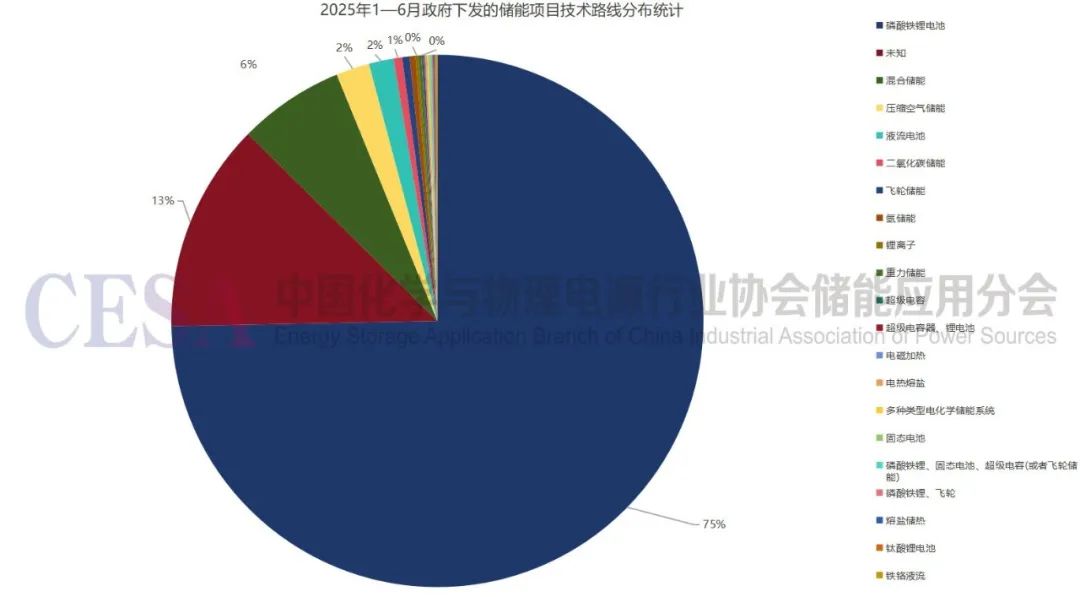 2025年1—6月,我国政府下发的储能项目技术路线呈现多元化与集中化并存的特点。磷酸铁锂电池以847个项目的绝对优势成为主流选择,占比超过六成,其成熟的技术体系与成本优势持续推动规模化应用。值得注意的是,144个项目标注为"未知"技术路线,反映出部分创新储能方案仍处于保密或试验阶段,行业探索步伐加快。